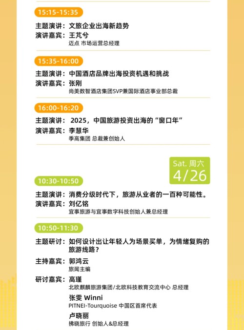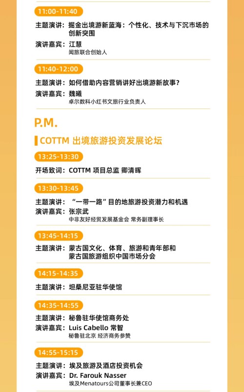 COTTM主办方也十分荣幸邀请到了中非友好经贸发展基金会、蒙古国文化、体育、旅游和青年部,秘鲁驻华使馆商务处、埃及Menatours集团,以及中国文旅出海投资企业代表性机构和平台如尚美数智酒店集团、季高集团和迈点等行业大咖来演讲。“COTTM投资论坛”持续为投资境外旅游目的地的中国文旅投资方与境外项目方提供商务对接平台。