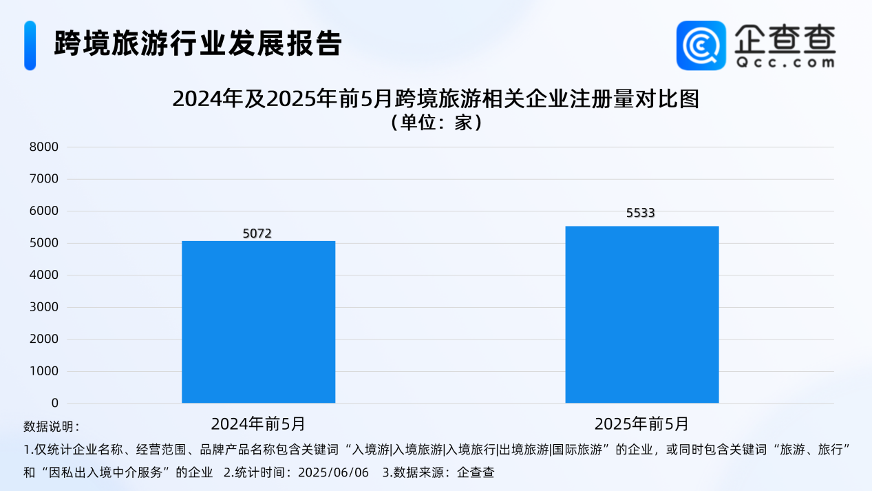 企查查数据显示,截至目前,今年已注册跨境旅游相关企业5624家,其中前5月注册5533家,同比增长9.09%。