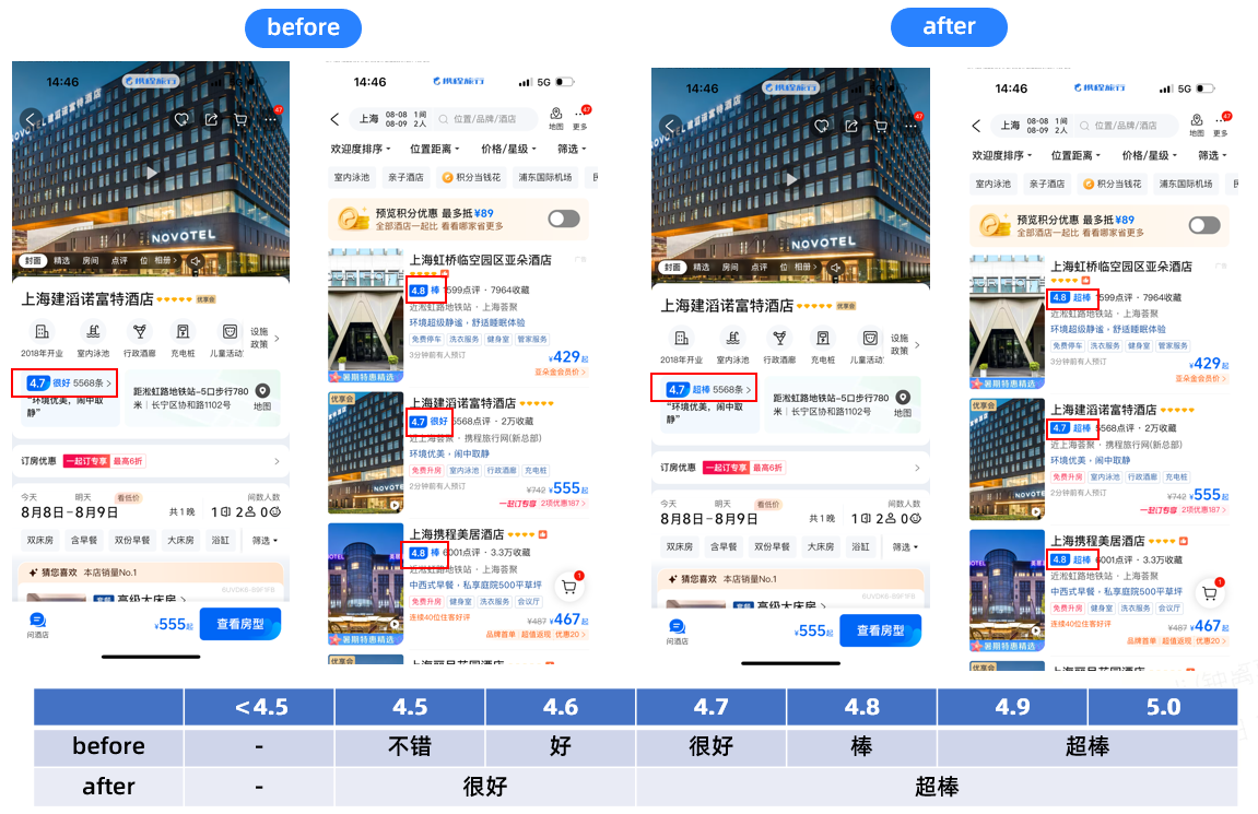 除了治理恶意行为,携程也在尝试从评分机制上为酒店减负。在携程此前发布的“智旅未来”商家赋能计划中,平台已将“超棒”酒店的标准从行业普遍追逐的4.8、4.9分下调至4.7分,减轻酒店为维持高分而陷入的“内卷式”竞争。