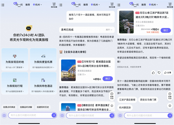 近日,飞猪AI“问一问”的专业旅行助手“团队”中,新增了一位“双11选品助手”,它能根据用户需求,推荐适合的机票次卡、酒店套餐等飞猪双11活动商品,并支持一键跳转商品页面查看详情和购买。
