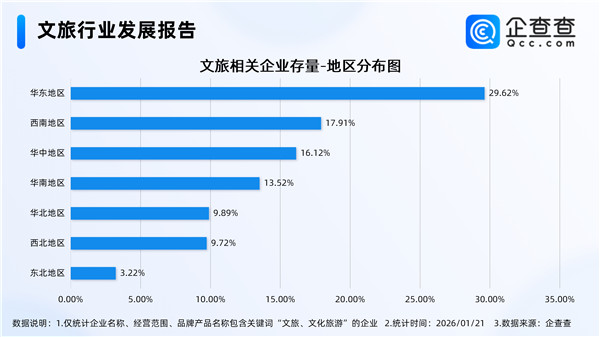 企查查数据显示,截至1月21日,国内现存文旅相关企业12.51万家。近十年文旅相关企业存量规模持续增长,2025年末存量达11.97万家,较十年前(2016年)增长了近5倍。从注册资本分布来看,文旅相关现存企业多为轻量级企业,注册资本在200万元以内的相关企业占比近半数。从地区分布来看,分布在华东地区的文旅相关企业最多,占比29.62%。注册量方面,2023年-2025年每年注册量均在2万家以上,其中2025年注册量达2.05万家。