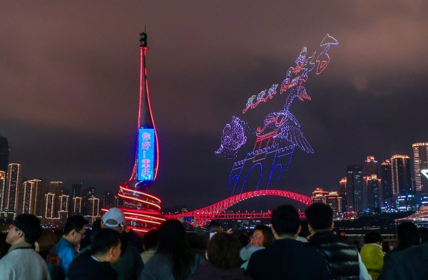 ▲无人机点亮绚烂夜空 美团黑钻会员体验官看重庆无人机灯光秀(摄影:韩张)