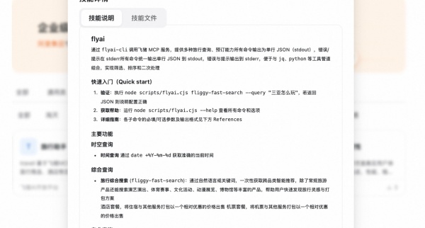 ClawHub上的说明文档显示,“flyai”基于飞猪MCP(模型上下文协议)作了标准化封装,提供覆盖机票、酒店、门票、用车、目的地玩乐以及机票次卡、酒店套餐等出行旅游商品的搜索、咨询、规划及预订等服务,横跨了导购到交易的完整链条。“flyai”的调用更方便,有开发者实测发现,区别于很多同类技能插件,“flyai”无需在飞猪官方平台注册、申领API Key(应用程序编程接口密钥),即装即用。