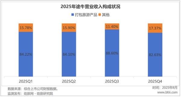 2025年四季度,途牛主营业务中,打包旅游产品收入占比为82.63%,其他收入为17.37%。