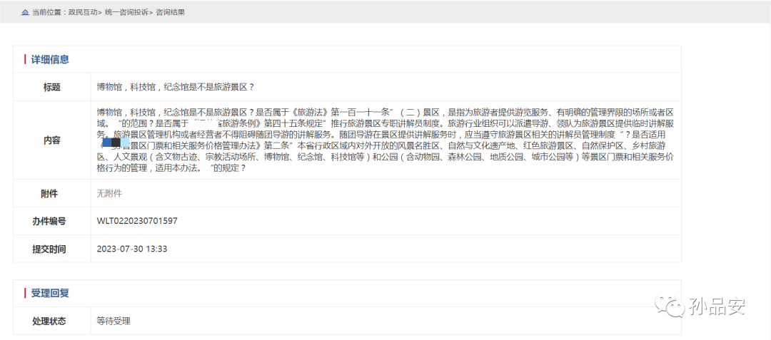 笔者通过查询“中国人大网”(立法机关)的权威“法律释义与问答”,咨询“部、省、市”三级文旅主管部门得到的关于‘博物馆,纪念馆,科技馆’是否属于景区的回复,试图确定法律意义上的“景区或旅游景区”定义的权威解释。