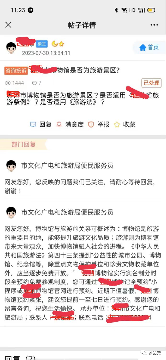 某市文旅局的回复:网友您好,博物馆与旅游的关系可概述为:博物馆是旅游的重要目的地,能够提升旅游文化品质;旅游则为博物馆带来大量观众,加快博物馆融入社会的进程。《中华人民共和国旅游法》第四十三条提到“公益性的城市公园、博物馆、纪念馆等,除重点文物保护单位和珍贵文物收藏单位外,应当逐步免费开放。”某市博物馆实行实名制分时段全预约免费参观制度,您可通过“某市博物馆全预约”小程序或某市博物馆官网进行预约。近期正值暑假,某市博物馆预约紧张,建议您提前一至七日进行预约。感谢您的留言咨询,祝您生活愉快。承办单位:某市文化广电和旅游局;联系人:YZD;联系电话:05XX6982XXXX——某市文旅局关于文博景区是否属于旅游景区的回复,也没有回答清楚,没有做直接回答。