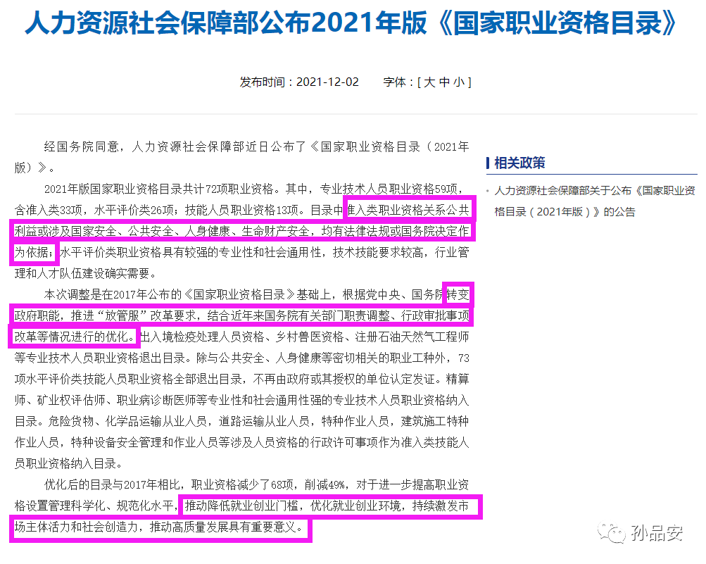 人社部官网2016年2月1日发布《职业资格集中清理工作基本完成——人社部相关负责人就第五批减少职业资格许可和认定工作进行解答》“近日,国务院印发《关于取消一批职业资格许可和认定事项的决定》,再次公布取消61项职业资格许可和认定事项。至此,职业资格集中清理工作基本完成”。“减少职业资格许可和认定工作”,“初步实现了国务院部门设置的、没有法律法规和国务院决定作为依据的准入类职业资格基本取消,国务院部门和全国性行业协会、学会未经批准自行设置的水平评价类职业资格基本取消。”“及时取消了一大批不合法、不合规、不合理的职业资格,初步遏制了职业资格过多过滥的势头,减少了人才从业壁垒,减轻了人才负担和社会成本,释放了人才创新创业新活力和人才体制机制改革新动能,推动了政府在人才管理方面的职能转变,提高了职业资格管理的科学化和规范化水平。”“取消这些职业资格,符合简政放权、转变政府职能的要求,有利于调动各类人才创新创造的积极性,营造就业创业的公平环境,减轻人才负担。这与提高行业从业人员素质是不矛盾的。为了提高其职业素质,近年来我们主要做了以下工作:一是颁布实施新修订的职业分类大典。二是构建劳动者终身职业培训制度。三是推进人才评价体制机制改革。四是加大竞赛表彰奖励力度。”“人社部将在坚持治标不放松的基础上,加大治本力度,把工作重点放到深入推进职业资格制度改革上来,主要做好四件事:一是实行职业资格目录清单管理制度。二是建立职业资格清理常态化机制。三是编制职业资格框架。四是加强职业资格设置实施监管。”