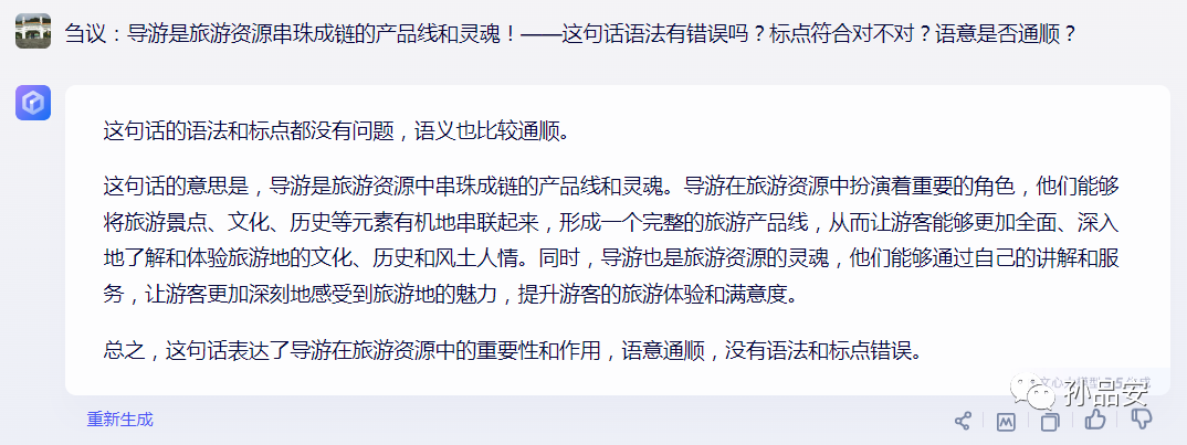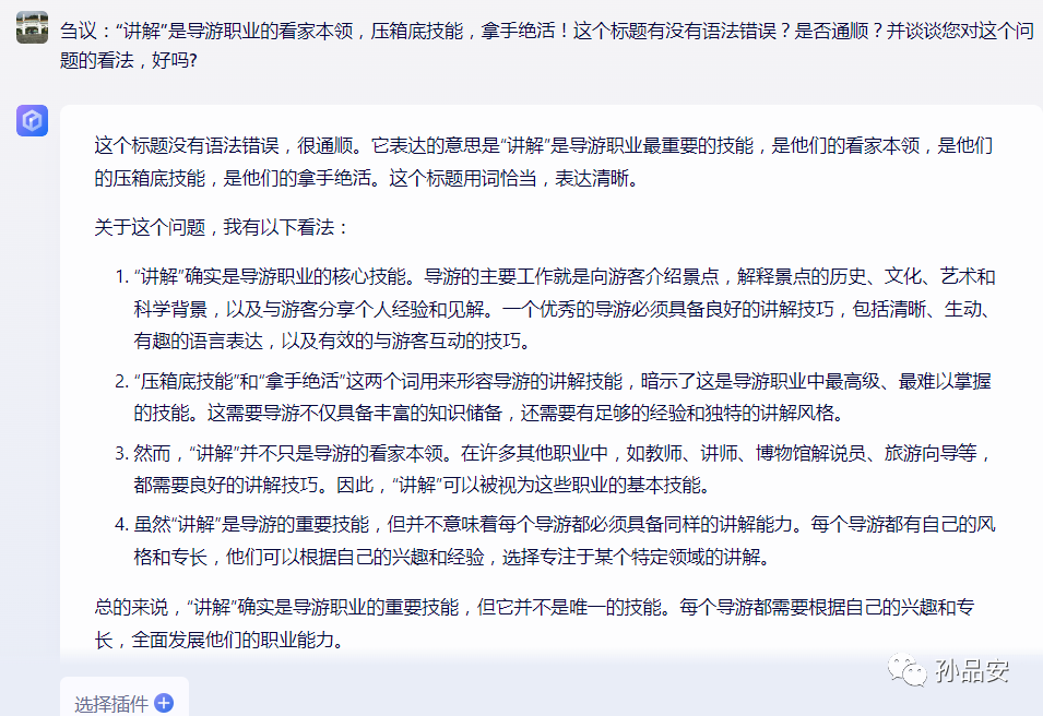 三、“孙品安”与“百度‘文心一言’就“刍议:‘讲解’是导游职业的看家本领,压箱底技能,拿手绝活”,关于语法问题、词句通顺及观点问题的讨论!
