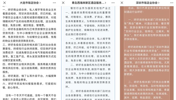 3月起,酒店行业协会率先行动,山东、深圳、大连、青岛、东莞、武汉、云南、晋城等地酒店行业协会陆续发文公开向外界求援,它们代表百万酒店业主提出多项明确诉求: