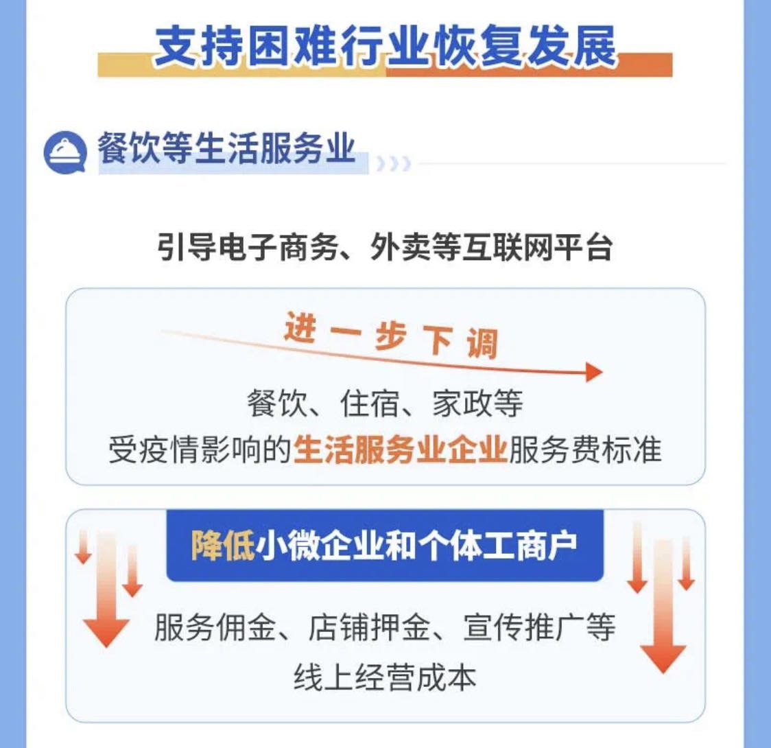 在上海最新推出的21条纾困政策中,再次明确提出“引导电子商务、外卖等互联网平台进一步下调受疫情影响的生活服务业企业的服务费标准”。