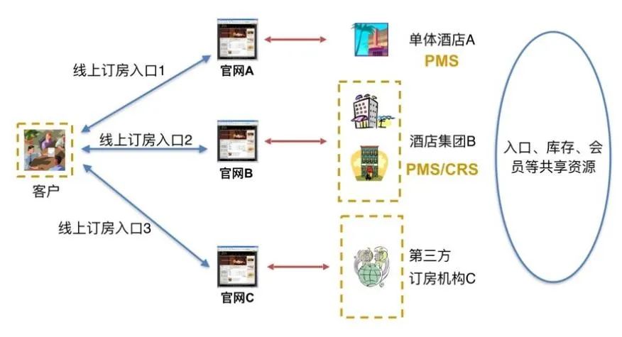 第一个系统是大家耳熟能详的中央预订CRS(Central Reservation System),它是连锁酒店集团最重要的营销系统,主要作用是把集团的直销渠道和分销渠道与酒店的PMS系统连接了起来。上端对接销售渠道,下端对接客房库存,内嵌CRM以及集中化的客户档案,源源不断地从直销和分销等各个渠道将订单输送给酒店,并且使得所有酒店可以协同管理客人档案、需求和喜好。所有大型的酒店集团,都在自建自己的CRS系统。