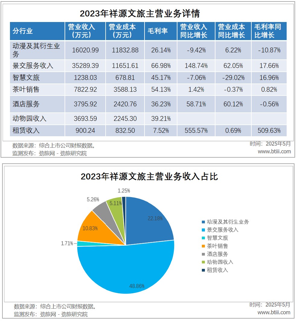 2023年主营业务中,动漫及其衍生业务收入16020.99万元,占总收入22.18%;景交服务收入35289.39万元,占总收入48.86%;智慧文旅收入1238.03万元,占总收入1.71%;茶叶销售收入7822.92万元,占总收入10.83%;酒店服务收入3795.92万元,占总收入5.26%;动物园收入3693.59万元,占总收入5.11%;租赁收入900.24万元,占总收入1.25%。