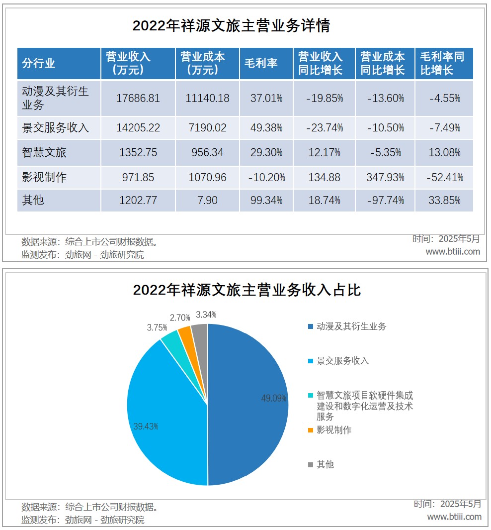 2022年主营业务中,动漫及其衍生业务收入为17686.81万元,占总收入49.09%;景交服务收入14205.22万元,占总收入39.43%;智慧文旅收入1352.75万元,占总收入3.75%;影视制作收入971.85万元,占总收入2.70%;其他收入1202.77万元,占总收入3.34%。