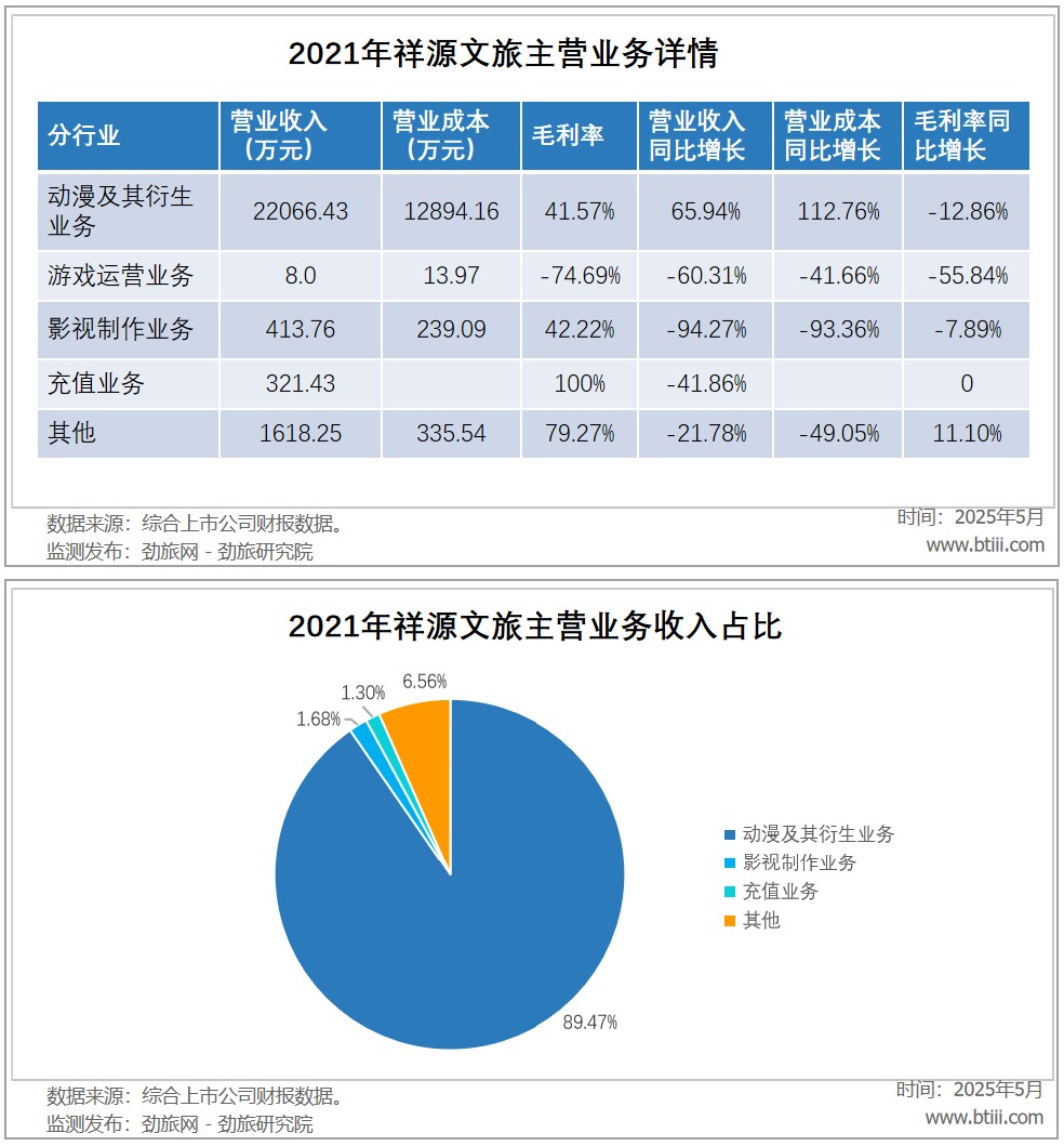 2021年主营业务中,动漫及其衍生业务收入22066.43万元,占总收入89.47%;影视制作业务收入413.76万元,占总收入1.68%;充值业务收入321.43收入,占总收入1.30%;其他收入1618.25万元,占总收入6.56%。