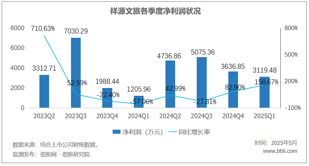 财报显示,2024年公司营业收入约为8.64亿元,归母公司净利润约1.47亿元,2025年一季度,祥源文旅净利润3119.48万元,上年同期为1205.96万元,同比增长158.67%。